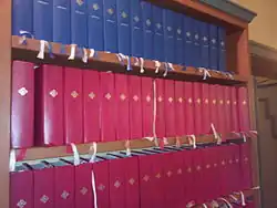 The 2013 Norwegian hymnal on a shelf at Meland Church. The red volumes are the standard edition and the blue ones are the large-print edition.
