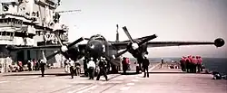 Two of the three prototypes crashed during testing, but their loss did not materially affect the development of the aircraft as the first batch of Savages had been ordered on 6 October 1947. The most significant difference between the XAJ-1 and the production aircraft was the revision of the cockpit to accommodate a third crewman in a separate compartment. The first flight by a production aircraft occurred in May 1949 and Fleet Composite Squadron 5 (VC-5) became the first squadron to receive a Savage in September.[7] The squadron participated in testing and evaluating the aircraft together with the Naval Air Test Center (NATC) in order to expedite the Savage's introduction into the fleet.[8] The first carrier takeoff and landing made by the bomber took place from the USS Coral Sea on 21 April and 31 August 1950, respectively. Many, if not most, surviving AJ-1s had their tails upgraded to the improved AJ-2 configuration.[9]