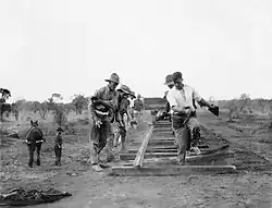 On the outbreak of the Pacific War, the Australian Army surveyed a rail route for the gap between Birdum and Alice Springs, on which freight had to be carried by road vehicles, but a line was not constructed.[6][7] The railway experienced very heavy traffic since it was a strategic route to operations north of Australia. In 1944, as many as 147 trains ran per week.[8] Larrimah, 9 kilometres (5.6 miles) kilometres north of Birdum, was used as the railhead because, unlike Birdum, it was on the Stuart Highway.[note 2]