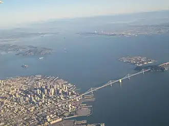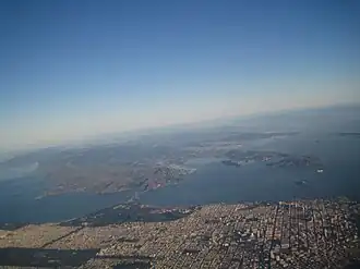 San Francisco is in the foreground in this picture looking north. San Pablo Bay continues north surrounded by parts of (left to right) Marin, Sonoma, Solano and Napa Counties.