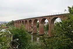 Two viaducts south of Montrose were designed by Sir Thomas Bouch, the architect of the original Tay Bridge but, due to delays in building the Tay Bridge and the line by Dundee, they were not built until 1879.[10] Construction was by Gilkes Wilson and Company, supervised by Bouch's son, William.[11] The more northerly bridge, the South Esk Viaduct, was of iron lattice girder construction.[12][note 3]