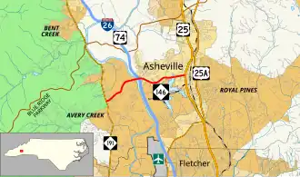 NC 146 begins its western end at NC 191 in the community of Avery Creek[2] a census-designated place (CDP) south of Asheville. NC 146 travels east and at just over 1.5 miles (2.4 km), immediately after crossing the French Broad River, intersects Interstate 26/U.S. 74 at exit 37. Passing exit 37, NC 146 enters the Asheville city limits and passes north of Lake Julian and Julian Lake Park before nearing its eastern end. At 3.51 miles (5.65 km), NC 146 reaches its eastern end at U.S. Route 25 in Skyland (but still within the Asheville city limits).[2]