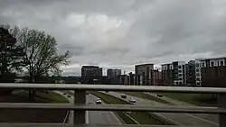 The Durham Freeway began with a 1962 bond referendum.[3] The first section of the road, completed in 1970 around downtown Durham, extended from Chapel Hill Street to Alston Avenue and resulted in the destruction of a portion of the Hayti neighborhood as part of urban renewal,[4] though a DOT engineer said the neighborhood likely would have been torn down anyway. The road was later extended west to Erwin Road and southward to where it meets I-40. In 1986, The freeway was designated as North Carolina Highway 147. The road's other names have included East-West Expressway and the I.L. "Buck" Dean Freeway.[3]
