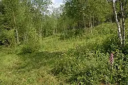 Chalk grassland is found on the steep south-facing scarp slopes and the more gently graded north-facing dip slopes, where woodland is absent. The alkaline soils are thin and nutrient poor, which prevents deeper-rooted lush grasses (with a high water demand) from dominating.[20] Each square metre of chalk downland may support up to 40 different species. This semi-natural habitat is maintained through sheep, cattle and rabbit grazing which prevents scrub encroachment. Chalk grassland to the west of the Medway Valley is dominated by upright brome and fescue, whilst grassland to the east is dominated by tor-grass.[1] Owing to the close proximity of the North Downs to the European continent, the warm climate and the south-facing escarpment, several plant species survive on the chalk grassland which are scarce or not found elsewhere in the British Isles.