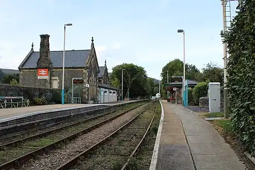 The station and its goods yard were opened on 17 June 1863 as the Llanrwst terminus of the Conway and Llanrwst Railway[5] that was taken over by the London and North Western Railway (LNWR) in 1867 and extended to Betws-y-Coed in 1869. To accommodate the southward extension, the station was resited on 6 April 1868. This station was renamed Llanrwst and Trefriw in April 1884[5] following the formal opening of the Gower pedestrian road to Trefriw in May 1881,[6] reverting to its original name Llanrwst during the British Railways era, on 6 May 1974.[5][7] The grade-II station buildings are largely intact, though mostly disused, and there is a working signal box north of the station at which trains must stop to exchange tokens. The extensive station yard is now used for light industry.