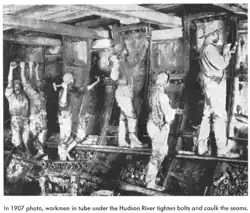Workers in the North River Tubes tighten bolts and caulk seams in 1907