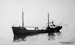 Motor ship built for H.J. Wilson, London as Goldfinder,[148] 130 ft (40 m) x 27.5 ft (8.4 m), draught 9 ft (2.7 m), able to carry about 480 tons, with a crew of 10.[149] In 1942 her 8-cylinder engine was replaced by a 250 hp (190 kW) 6-cylinder engine.[150] In 1948 her steering gear broke in the Red Sea, when she was on her way to join NSS,[151] who renamed her Apanui in 1949, when she began a Raglan-South Island route.[152] In 1961 she was sold to H. Williams, Cook Islands and belonged to D.C. Brown, before being declared unseaworthy and scuttled off Avatiu on 24 December 1965.[153]
