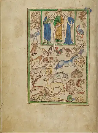 The Northumberland Bestiary (MS 100) is an illuminated manuscript and bestiary dating from 1250-1260. It was originally known as the Alnwick Bestiary (MS 447) as it resided in Alnwick castle from the eighteenth century until 1990 when it was sold to a private collection. In 2007 it was acquired by the Getty Museum and still resides there today.[1] Sources for the Northumberland Bestiary include the Greek Physiologus and Hexaemeral literature. Bestiaries traditionally fall into four families however the Northumberland Bestiary is a transitional manuscript which draws upon the first and second families of manuscripts.[1] It is a small Quarto measuring only 8" x 6" and it contains chapters regarding the creation of man, naming the animals, beasts, birds, fish, serpents, the condition of man, and trees.[1] Bestiaries in general function as teaching aids for clerics.[2] In modern scholarship, the Northumberland Bestiary and other bestiaries entries on Hyenas has been an area of research for Jewish histories.[3][4]