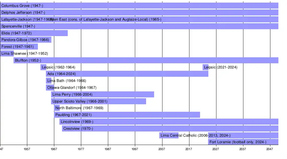 Lincolnview entered conference for the 1965–66 season, basketball only. Lincolnview never fielded a football program.