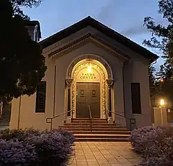 The Notre Dame de Namur University campus developed around Ralston Hall Mansion. William Chapman Ralston built Ralston Hall shortly after purchasing the property in 1864.[18] William Ralston was a pivotal figure in the gold and silver bonanzas, which helped Ralston amass wealth. Ralston Hall was built with a steamboat gothic design on the interior, which is rumored to have been influenced by Ralston's love of boating from a young age.[19] The interior of Ralston Hall is strikingly shaped like the inside of a boat.[19] Ralston Hall was built as an entertainment destination.[19] After William Ralston died, his business partner, William Sharon, came to control the mansion.[19] Sharon was a United States senator representing Nevada from 1875 to 1881.[19] Ralston Hall has been used for a variety of jobs throughout its history; Ralston Hall held one of the largest American weddings when William Sharon's daughter Flora married Sir Thomas Fermor-Hesketh of England.[19] The mansion was a finishing school for young women until 1898.[20] Since 1923 Ralston Hall has been affiliated with Notre Dame de Namur University.[20]