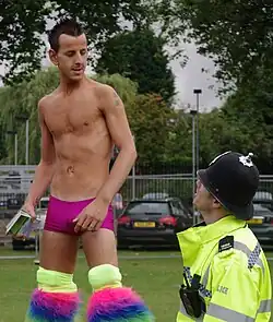 A man on stilts talks to a police officer at Nottingham Pride 2010.