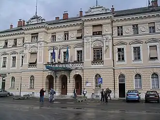 Station building, in front of Europe Square / Transalpina Square. This image is taken from the centre of the square, which is crossed by the Italian–Slovene border.