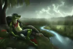 Art generated by NovelAI's furry diffusion model, depicting a dragon in a forest