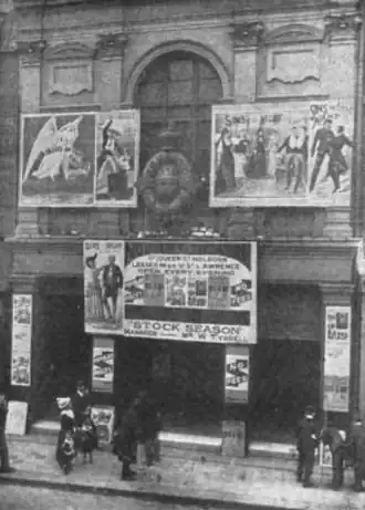 The first theatre on the site was built to designs by Thomas Verity with decorations by E. W. Bradwell, and opened on 9 December 1882. Its first show was the comic opera Melita or the Parsee's Daughter,[2] composed by Henry Pontet, with a libretto by Juba Kennerley.[3][1] It hosted, among other notable works, a revival of Les Cloches de Corneville and Ascot, by Percy Fendall, in 1883.[4] Edward Solomon and James Mortimer's Polly or The Pet of the Regiment played at the theatre in 1884.[5] The Blue Bells of Scotland, by Robert Williams Buchanan, premiered at the theatre in 1887, followed by James Mortimer's The Alderman and Fred Marsden's Bob, both in 1888.[6] The Russian National Opera Company produced The Demon at the Novelty in 1888, and the theatre hosted the London premiere of Henrik Ibsen's A Doll's House in 1889. In August 1896, Wilfred Moritz Franks accidentally stabbed Temple E. Crozier fatally onstage during a performance of Frank Harvey's melodrama, Sins of the Night.[7] The Merchant of Venice was presented at the theatre in 1897.[8]