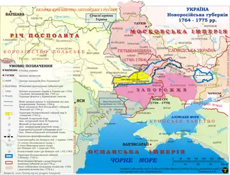 Novorossiya Governorate[a] was an administrative-territorial unit (guberniya) of the Russian Empire, which existed in 1764–1783 and again in 1796–1802. It was created and governed according to the "Plan for the Colonization of New Russia Governorate" issued by the Russian Senate.[1] It became the first region in Russia where Catherine the Great allowed foreign Jews to settle.[1]