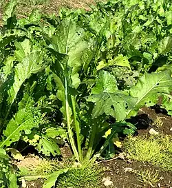 Its leaves are approximately 60–90 centimetres (24–35 in) long. If left to overwinter without harvesting, the rapeseed will sprout and yellow rapeseed flowers will bloom in the spring.[2]