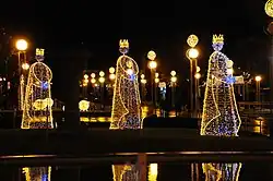 In addition to traditional Christmas decorations, it is common among Uruguayan Christians to put up a balcony banner with an illustration of the nativity scene that reads "Christmas with Jesus".[46] These banners were launched in 2016 as part of a campaign carried out by the Catholic Church in Uruguay to "raise awareness about the true meaning of the holiday" in a highly secular country.[47] Pope Francis welcomed the initiative and was photographed with one in the Vatican City.[48]