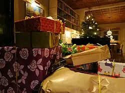 Christmas traditions for many nations include the installing and lighting of Christmas trees, the hanging of Advent wreaths, Christmas stockings, candy canes, setting out cookies and milk, the creation of Nativity scenes depicting the birth of Jesus Christ and giving gifts to others.[1] Christmas carols may be sung and stories told about such figures as the Baby Jesus, Saint Nicholas, Santa Claus, Father Christmas, Christkind or Grandfather Frost. The sending and exchange of Christmas card greetings, observance of fasting and special religious observances such as a midnight Mass or Vespers on Christmas Eve, the burning of a Yule log, and the giving and receiving of presents are also common practice. Along with Easter, Christmas is one of the most important periods on the Christian calendar, and is often closely connected to other holidays at this time of year, such as Advent, the Feast of the Immaculate Conception, Saint Nicholas Day, Saint Stephen's Day, New Year's, and the Feast of the Epiphany.[2]