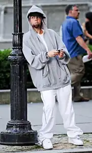 In 2001, Carey decided to venture into the film industry with her debut acting role, Glitter.[11][12] It was a critical and commercial failure,[11][12] which led to Carey's $100 million recording contract being bought out by Virgin Records, who paid her $49 million to part ways.[11] Carey also had personal life conflicts and erratic behavior in public appearances, leading to the singer being hospitalized.[13][14] During this period in Carey's personal life, American rapper Eminem claimed to date Carey for six months.[15] After this Eminem referred to Carey in several of his songs in a negative light, feeling angered by her disowning their alleged relationship.[16] The back-and-forth through songs continued with "Clown" on Carey's album Charmbracelet,[17] her 2001 interview tapes being faked as voice recordings being played at Eminem's Anger Management Tour.[18] After playing the excerpt, Eminem would pretend to be sick before launching into his song "Puke".[18]