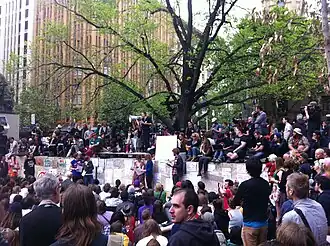 Occupy Melbourne was a social movement which took place from late 2011 to mid 2012 in Melbourne, Australia as part of the global Occupy movement[1][2] Participants expressed grievances concerning economic inequality, social injustice, corruption in the financial sector, corporate greed and the influence of companies and lobbyists on government. Protests began on 15 October 2011 in City Square with a 6-day-long protest encampment, from which people were forcibly evicted by Victoria Police at the request of the City of Melbourne CEO on 21 October 2011.[3] From 2 November 2011, Occupy set up camp in Treasury Gardens before being moved on from that location in December.[4][5] A significantly diminished number of protesters set up camp at Father Bob's church at his invitation until his retirement in January 2012. Physical manifestations of the movement had largely dissipated by mid-2012 though it adopted a strategy of decentralisation and became influential in the creation of new community networks, affinity groups and collectives.