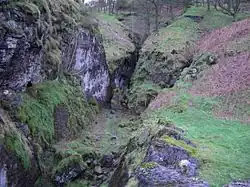 The veins of lead in the Castleton area formed 280 million years ago when a fault in the local Carboniferous limestone allowed mineralising fluids to flow into fissures in the rock, pushed up by great pressure from beneath the Earth's surface. Lead and sulphate combined to form the lead ore galena. In its heyday, the mine was a complex system of levels and shafts that extended for approximately 1500 metres into the Edale shales beneath the nearby Mam Tor. In the early days the mining was open cast, forming a gorge in the hillside with the water diverted by a leat to the north to keep the workings dry. Later the miners followed the vein of lead underground. The vein is exposed on the surface in a small limestone outcrop at the entrance to the mine and then continues underground just south of due west in the limestone under the Edale shales of Mam Tor. The 1769 plans of the mine show that there were several branch veins leading from the main lead workings. There are several small pipe caverns contained within the mine; the most prominent of these is Odin Cave (called Gank Hole by the miners) which was formed by groundwater opening out a void between limestone boulders. There is no evidence that Blue John was ever mined at Odin although the adjacent Treak Cliff Cavern regularly mines the rock in areas not open to visitors.[8]