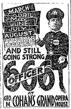 3. ^ "'OFFICER 666' FARCE OF MANY SURPRISES; New Play at the Gaiety Has Lots of Humorous Situations and Bright Dialogue. MISTAKEN IDENTITY PLOT George Nash as Burglar Who Poses as Artist and Wallace Eddinger as Bogus Policeman Score. (Published 1912)". The New York Times. 30 January 1912. Archived from the original on 26 July 2018.