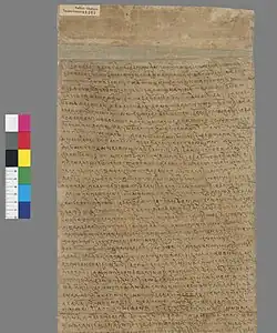 The Old Tibetan Chronicle is extant in two manuscripts in the Pelliot Collection at the Bibliothèque nationale de France in Paris, and some manuscript fragments. The main scroll comprises Pelliot tibétain 1286 and Pelliot tibétain 1287. The Tibetan text is written on the blank verso sides of panels pasted together from Chinese scrolls. In the first critical edition of Pelliot tibétain 1286 and Pelliot tibétain 1287, Jacques Bacot and Charles Toussaint considered them to be represent separate texts and referred to Pelliot tibétain 1286 as "Principautés anciennes et généalogie des rois," but following the suggestion of Geza Uray, both are now considered to be two parts a single original manuscript and can be referred to together as the Old Tibetan Chronicle.[4] In addition, two folios from a single original manuscript, Pelliot tibétain 1144 and IOL Tib J 1375, overlap with narratives found in the Chronicle, though differing in certain details.