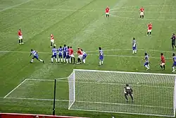 Solskjær's opportunities were limited at the start of the 2000–01 season, however he scored on his second start of the season on 16 September 2000 as United beat Everton 3–1.[90] On 31 October, he netted a brace during a 3–0 victory against Watford in the League Cup third round, scoring in the 12th and 81st minutes.[91] He scored another brace on 23 December, against Ipswich Town in a 2–0 victory.[92] Three days later, Solskjær helped United snatch a 1–0 win against Aston Villa, with the Norwegian heading in a David Beckham cross in the 85th minute.[93] Solskjær scored the first goal of United's 2–1 FA Cup third round win over Fulham on 7 January 2001.[94] On 25 February, he netted Manchester United's fifth goal against Arsenal (their closest title rivals) in United's 6–1 demolition,[95] which sent them 16 points clear at the top of the table.[96] On 10 April, he scored the winning goal in United's 2–1 victory over Charlton Athletic, scoring only six minutes after coming on in the 76th minute.[97] Manchester United wrapped up the Premier League title in April – their third consecutive title, and Solskjær's fourth.[98][70] That season Solskjær scored 10 league goals in 31 appearances (19 starts).[99]