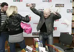 On 22 March 2009 a Femen activist threw a cake at Oles Buzina, protesting his book in which he defended men's rights.