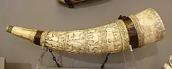 Olifant (also known as oliphant) was the name applied in the Middle Ages to a type of carved ivory hunting horn created from elephant tusks.[1] Olifants were most prominently used in Europe from roughly the tenth to the sixteenth century, although there are later examples.[2] The surviving inventories of Renaissance treasuries and armories document that Europeans, especially in France, Germany, and England, owned trumpets in a variety of media that were used to signal, both in war and hunting. They were manufactured primarily in Italy (from either African or Indian elephant tusk), but towards the end of the fifteenth and early sixteenth centuries, they were also made in Africa for a European market.[1] Typically, they were made with relief carvings that showed animal and human combat scenes, hunting scenes, fantastic beasts, and European heraldry.[1] About seventy-five ivory hunting horns survive and about half can be found in museums and church treasuries, while others are in private collections or their locations remain unknown.[3]