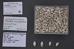 Olivella minuta, common name the minute dwarf olive, is a species of small sea snail, marine gastropod mollusk in the subfamily Olivellinae, in the family Olividae, the olives. Species in the genus Olivella are commonly called dwarf olives.[2]