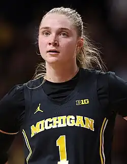 Olson enrolled at the University of Michigan in 2024. She began her collegiate career in the starting lineup, wearing the No. 1 jersey in a 68–62 loss to the No. 1 ranked South Carolina Gamecocks on November 4, 2024.[25][26] At the 2024 Fort Myers Tip-Off, Olson earned All-Tournament honors as 7–1 Michigan stretched its win streak to 7 games.[27] Her performance in the tournament included her first NCAA career double-double with a 19-point/11-rebound effort in the first game against Belmont on November 29.[28] On December 9, Olson earned her first Big Ten Freshman of the Week honor for her 18-point effort against Northwestern the day before.[29][30] On January 29, 2025, Olson posted her a career-high 30 points along with 3 steals and 4 rebounds against Wisconsin.[31] By following this up with an 18-point/10-rebound double-double on February 2 against Oregon, she earned a second Big Ten Freshman of the week honor.[32] In the regular season of her freshman year, she averaged 16.0 points, 5.3 rebounds, 2.0 assists and 1.4 steals in 29.9 minutes per game.[33] Following the season she was named Co-Big Ten Freshman of the Year by the coaches, along with Jaloni Cambridge.[34]