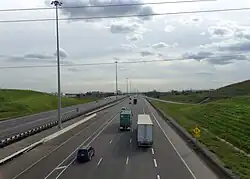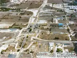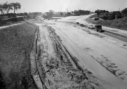 Construction of the Toronto Bypass began near Yonge Street in 1949 (along present-day Highway 401) and on the four-laning of Highway 27 in 1953.[11][12] The Highway 27 work involved the construction of two interchanges: a three-way interchange at Highway 401 and a large cloverleaf at the QEW, the latter of which would become one of the worst bottlenecks in the province a decade after its completion, according to Minister of Transportation Charles MacNaughton.[13] By September 1956, it was possible to bypass Toronto entirely on the four lane divided highway composed of Highway 401 and Highway 27.[14][15] Highway 401 was extended to the west soon after,[16] but Highway 27 remained a two-lane highway north of it.[17]