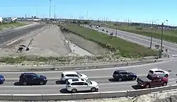 Highway 401's new junction with Highway 27 remains the largest interchange in Canada as it sprawls over 156 ha (385 acres) and required the construction of 28 bridges and the equivalent of 46.6 km (29 mi) of two-lane roadway, being built around the existing Richview Memorial Cemetery. On Highway 401 this required the removal of the existing interchange with Highway 27 as well as the half-cloverleaf interchange with the Airport Expressway which was 1 km (0.62 mi) to the west as both were originally conceived as separate routes. These two separate interchanges were replaced with a single large junction, where north of Highway 401 the collector lanes would continue the Highway 27 routing while the express lanes would shift westward to meet the rebuilt Airport Expressway. The reconstructed interchange also including connections to Eglinton Avenue (ultimately meant for the proposed but never-built municipal Richview Expressway) from all directions except for Highway 401 east of that interchange, while Carlingview Drive received ramps to Highway 401 east of that interchange.[28] While the new interchange with the QEW was opened to traffic on November 14, 1969,[29] the more complex Highway 401 junction required several more years of construction staging, fully opening on December 4, 1971 (though portions were opened in the weeks prior to that). On that same date, Highway 427 was inaugurated as it assumed the collector-express portion of Highway 27 and the new Airport Expressway. North of Highway 401, while the existing Highway 27 remained a provincial route as it transitioned from an expressway to an arterial road, the parallel section of Highway 427 effectively served as a freeway bypass.