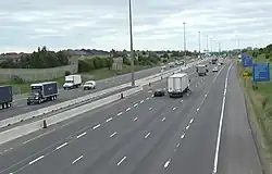 In 1963, MacNaughton announced that Highway 401 would be widened from a four-lane highway to a collector-express system, modeled after the Dan Ryan Expressway in Chicago.[15] Plans were soon developed to apply this model to the QEW between Highway 27 and Royal York Road and to Highway 27 between the QEW and Highway 401, and were unveiled to Etobicoke council on October 13, 1966.[22] Design work followed and was completed by May 1967.[23] The widening of Highway 27 required the demolition and rebuilding of overpasses at Bloor Street, Burnhamthorpe Road, and Rathburn Road constructed just over a decade earlier.[23] The rest of the route was rebuilt by September 1968, the next stage involved the reconstruction of the interchanges with QEW and Highway 401 which were reconfigured into complicated multi-level interchanges to permit free-flow movement.[24][1][25]