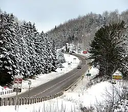 Entering the larger rural Town of Bancroft, Highway 62 travels through the community of L'Amable and around the lake of the same name.[4] It enters the village of Bancroft, where it is maintained as a Connecting Link as it meanders alongside the York River. The Connecting Link begins south of Bay Lake Road and stretches 7.7 km (4.8 mi) through the village to Victoria Drive.[2][3] Within the centre of the village, Highway 62 intersects and is briefly concurrent with Highway 28 along Bridge Street, crossing the York River. South of this concurrency, it is known as Mill Street, while north of the concurrency it is known as Hastings Street.[5]
