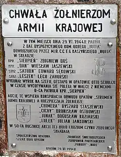 During the joint German–Soviet invasion of Poland, which started World War II, in September 1939, Opatów was invaded and afterwards occupied by Germany. In 1939, the Germans ordered the demolition of the Ludwik Zwierzdowski monument, so the local mayor buried it to preserve it, thanks to which it was restored after the war.[7] In 1940 the Germans carried out mass arrests of Poles as part of the AB-Aktion. Poles arrested in March were either deported to Nazi concentration camps or massacred in Góry Wysokie, while those arrested in June were imprisoned and tortured in Skarżysko-Kamienna and then murdered.[8] Opatów was a large center of the Polish underground resistance movement. Polish underground press printed in nearby Sandomierz was distributed in Opatów since 1940, and from November 1943 a secret Polish printing house was also launched in Opatów.[9] On March 11, 1943, the Germans carried out mass arrests of local Poles, including resistance members.[10] On the night of March 12–13, 1943, a Polish underground partisan unit Jędrusie, together with soldiers of the Home Army, carried out a successful attack on the local German prison and liberated 80 prisoners, before the Germans would deport them elsewhere.[10] In June 1944, the Home Army assassinated the local Gestapo chief Otto Schultz.[11]