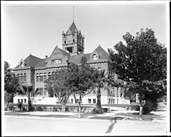 In June 1893, the county purchased a site for a new permanent courthouse from Spurgeon for US$8,000 (equivalent to $280,000 in 2024), in the block bounded by Sixth, Church, West, and Sycamore (now Santa Ana Blvd, Civic Center Dr, Broadway, and Sycamore, respectively); however, the first building erected on this site was the county jail, completed in 1897.[4]: 9  In 1899, the county board of supervisors solicited plans for a new courthouse, approving a revised design by C. B. Bradshaw and John Parkinson on October 3, and submitting a bond measure to raise US$100,000 (equivalent to $3,780,000 in 2024), which the voters passed on September 5.[4]: 10  However, Bradshaw & Parkinson withdrew after two supervisors alleged a plastering contractor said "it would be $400 in my pocket" if the Bradshaw & Parkinson plans were approved, and the supervisors instead approved a design by Charles L. Strange on December 20.[4]: 10–11 [5]: 96  The Romanesque Revival design used red sandstone facing from Arizona and granite blocks from Temecula.[4]: 12 [6] Blee & McNeill were selected as the constructors and the cornerstone was laid on July 4, 1900.[4]: 12–13  When it was completed and accepted on September 23, 1901, it was the tallest building in the county, standing 135 ft (41 m) high at the top of the cupola with a footprint of 136 ft × 88 ft (41 m × 27 m). The courthouse was formally opened on November 12, 1901.[4]: 15  The final cost of the 1901 courthouse was estimated to be US$117,000 (equivalent to $4,420,000 in 2024).[5]: 96  After it was damaged in the 1933 Long Beach earthquake, the cupola was removed.[4]: 27–28 [7]
