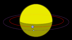 Illustration of Io–Europa–Ganymede resonance. From the centre outwards: Io (yellow), Europa (gray), and Ganymede (dark)