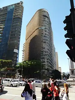 In 2013, soon after Niemeyer's death, the Brazilian street artist Eduardo Kobra[71] and four other painters paid their tribute to the architect with a gigantic mural, covering the entire side of a skyscraper at Paulista Avenue in São Paulo's financial district.[72] The artwork is inspired by Niemeyer's architecture, his love of concrete and Le Corbusier.