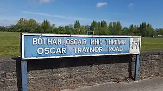 The ground is situated on the road from Coolock to Santry, which is named for former Football Association of Ireland President Oscar Traynor.