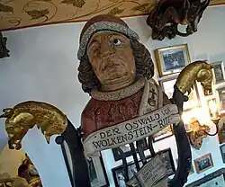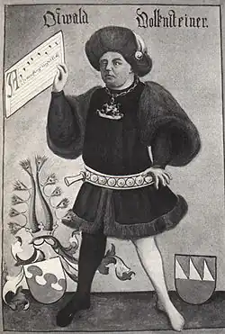 Oswald von Wolkenstein (1376 or 1377 in Pfalzen[1] – August 2, 1445, in Meran) was a poet, composer and diplomat. In his diplomatic capacity, he traveled through much of Europe to as far as Georgia (as recounted in "Durch Barbarei, Arabia").