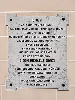 On the previous day, the 11th, in the chapel of the Franciscan Sisters of San Gwann, the relics of the holy martyrs Jucundian and Joshua were prepared, which, according to the ritual of the consecration of the church at that time, had to be buried in the middle of the mensa of the high altar. At 3.00 pm on the same day, Archbishop Mons. Michael Gonzi arrived at the nuns to seal the relics. Then, at 5.00 pm a penitential procession with the relics took place along the main streets of San Ġwann. The next morning, on the 12th of May, the relics were transported in a procession led by Archbishop Gonzi, assisted by Mons. Emanuel Vella and Mons. Giuseppe Lupi. Then the consecration ceremony of the church was held by the archbishop.[6]