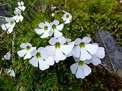 Ourisia caespitosa forms natural hybrids with several other species of Ourisia in New Zealand.[5] Ourisia × prorepens Petrie[18][19] is an interspecific hybrid between O. caespitosa and O. sessilifolia. O. × cockayneana Petrie[20][19] is another named interspecific hybrid between O. caespitosa and O. calycina. Other hybrids that have been collected at least once include O. caespitosa × macrocarpa, O. caespitosa × macrophylla, O. caespitosa × glandulosa, and O. caespitosa × simpsonii.[5]