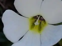 Close up of flower of Ourisia caespitosa, showing three lines of hairs inside corolla tube