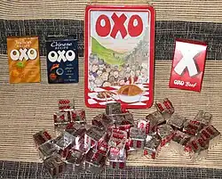 Oxo (stylized OXO) is a brand of food products, including stock cubes, herbs and spices, dried gravy, and yeast extract.[1] The original product was the beef stock cube, and the company now also markets chicken and other flavour cubes, including versions with Chinese and Indian spices. The cubes are broken up and used as flavouring in meals or gravy or dissolved into boiling water to produce a bouillon.