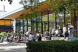 The campus offers a variety of leisure offerings for students and staff of the university. On the main campus, a cafeteria/canteen provides food supply for staff and students.[10] In the institutional building, there are several sitting areas, a student café called Matrikü(h)l which is operated by older students. The institutional building is also home to the AStA, the student committee of the PH Schwäbisch Gmünd, which helps students with general questions and organizes events.[11]