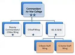 Since 1996, the college is commanded by an Air Vice Marshal. Under the Commandant is a Deputy Commandant/Chief Instructor War Wing, which are both Air Commodores. In March, 2021, the College was upgraded to Institute (Degree Awarding Institute - DAI). Consequently, the 'Commandant' designation was replaced by the 'President' Air War College Institute. The Officer Commanding the Junior Command & Staff School is a Group Captain, who has a Chief Instructor Basic Staff Wing and Chief Instructor Junior Staff Wing under him.