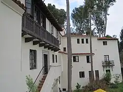 During the period of Mexican rule of California, the land that became Pacific Palisades belonged to Rancho Boca de Santa Monica, granted by the governor of California to Francisco Marquez and Ysidro Reyes in 1839.[13] The Ysidro Reyes Adobe was the first adobe home ever built in Santa Monica Canyon, erected in the year 1838 on land now known as Pampas Ricas Blvd in Pacific Palisades.[14] Sketches of adobe dwelling exist in the collection of the UCLA Library.[15][16] A memorial plaque sits in a boulder on Pampas Ricas Blvd commemorating the adobe house, dedicated in the 1950s.[17] Ysidro Reyes died in 1863. Reyes left his portion of Rancho Boca de Santa Monica to his widow, Maria Antonia Villa, who sold it to developer and railroad magnate Robert Symington Baker in 1875.[18]