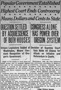 A 1902 constitutional amendment in Oregon adopted both the initiative and the referendum in that state.[1] By a nearly ten-to-one margin in 1906, voters imposed via initiative a two-percent tax on telephone and telegraph companies' revenues.[4] The Pacific States Telephone and Telegraph Company refused to pay it, and the state sued to collect the tax.[3] In court, the corporation argued, among other things, that because the initiative constituted direct democracy, it was contrary to the representative system that was integral to the republican form of government required by the Constitution.[1][4] After Oregon's state courts ruled the tax valid, the company appealed to the U.S. Supreme Court, making the sole argument that the initiative violated the Guarantee Clause.[3][4]